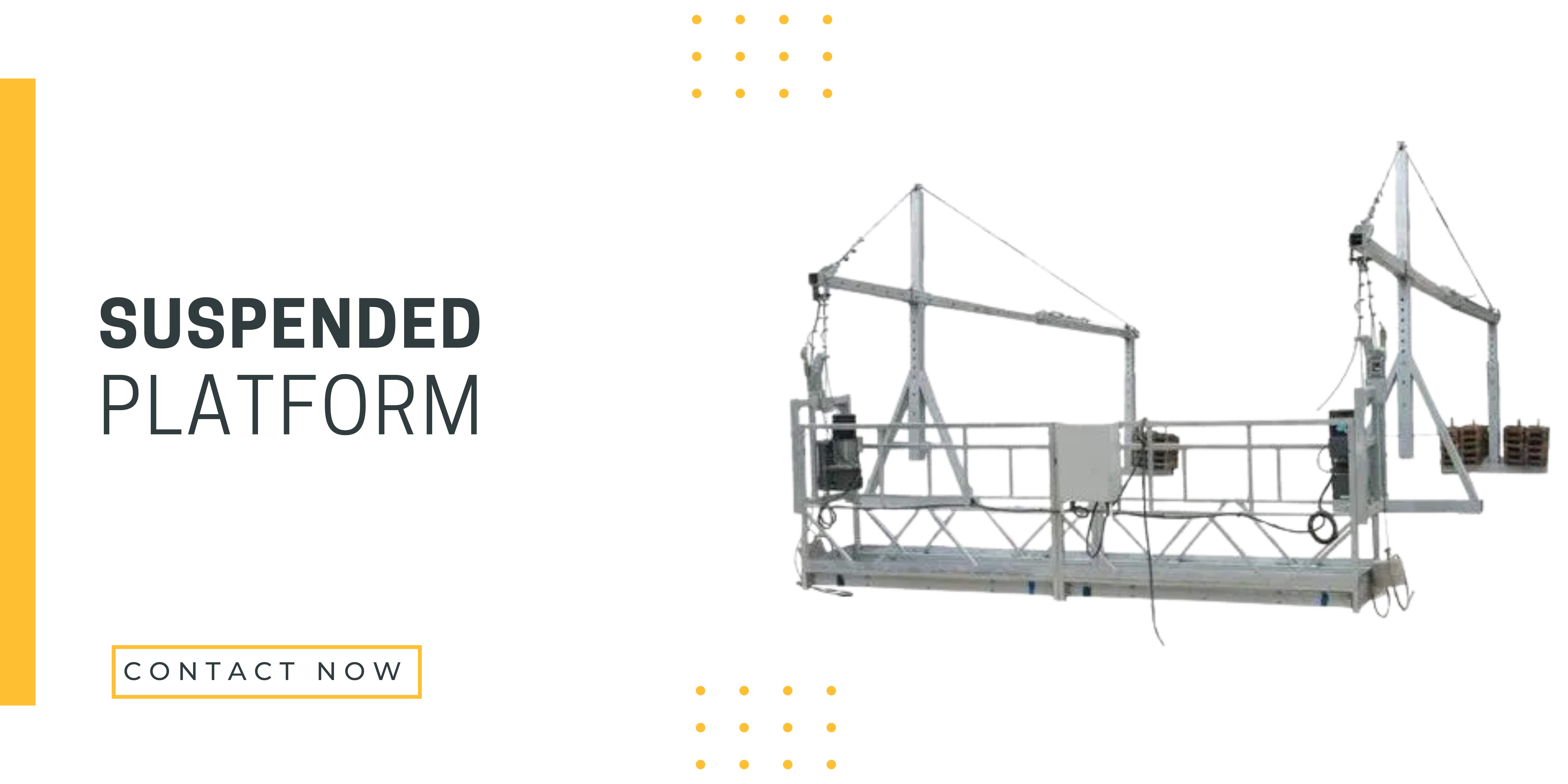 A suspended platform is a type of work platform or scaffold that is suspended from a structure, such as a building or bridge, to provide access for maintenance and construction work. It typically consists of a metal or steel frame with a platform or deck made of metal grating or solid sheets. The platform is suspended by cables or ropes attached to a winch or hoist mechanism, which allows it to be raised or lowered as needed.